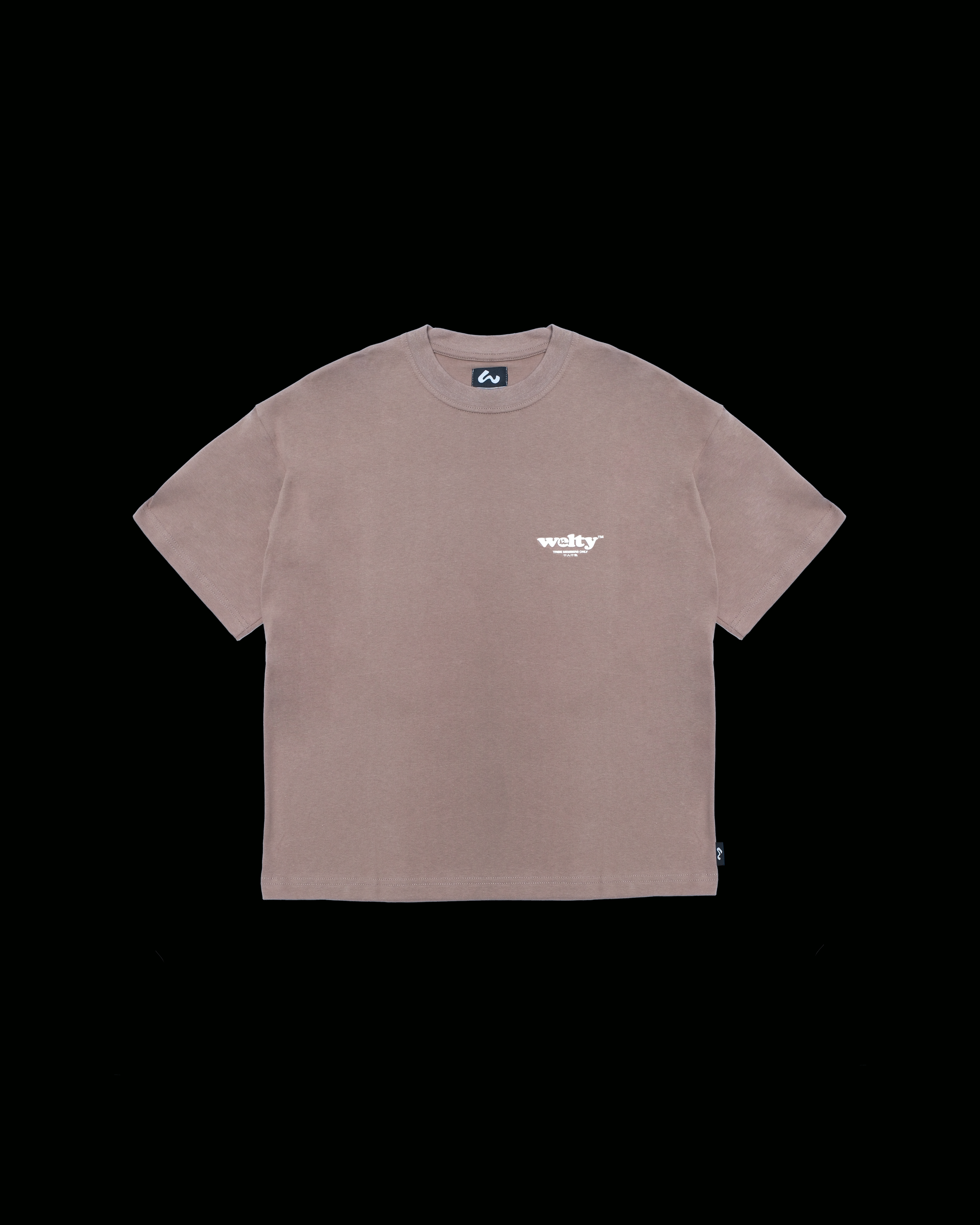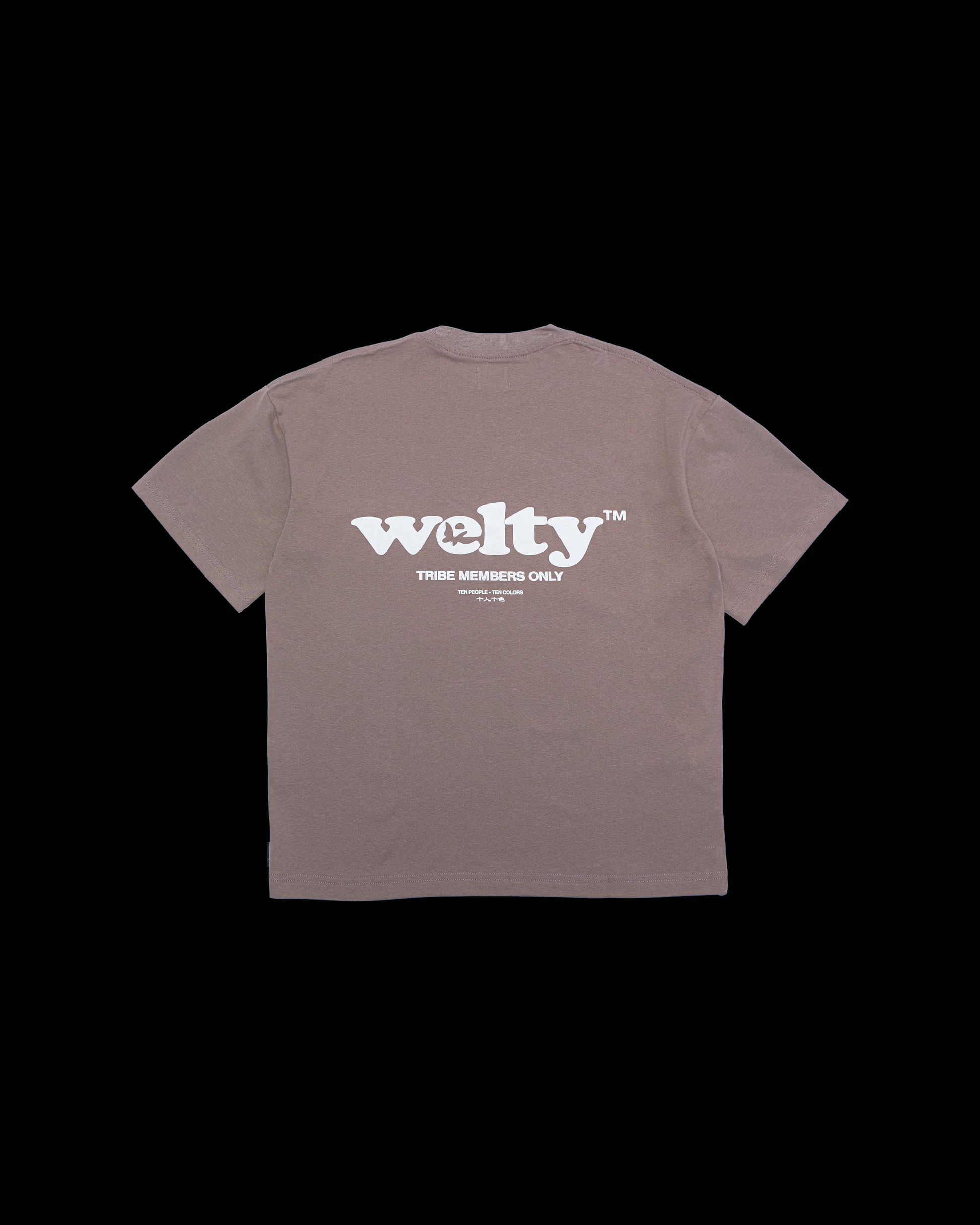 This walnut brown jersey t-shirt showcases Welty's "Tribe Members Only" graphic branding on both the chest and rear, while a logo label appears at the hem.